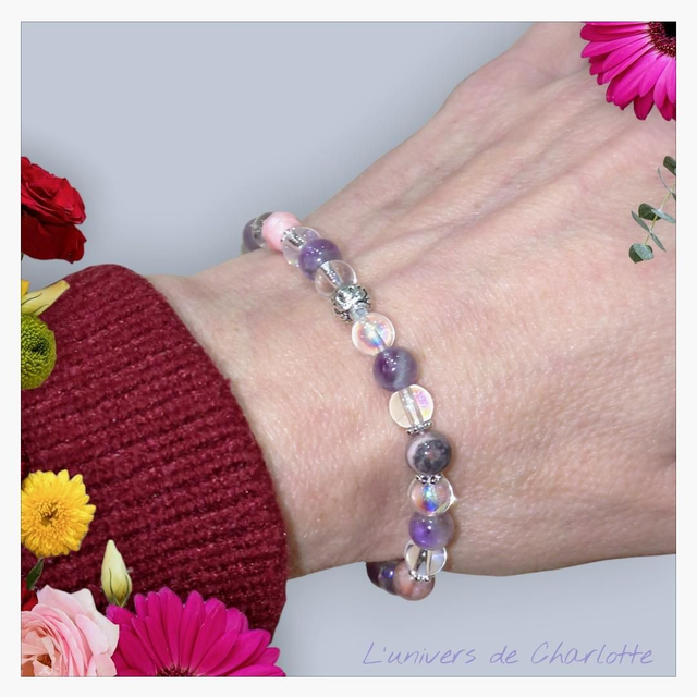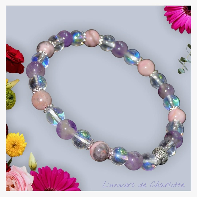 Bracelet trinité : Améthyste + Cristal de roche aqua aura + Jaspe rose