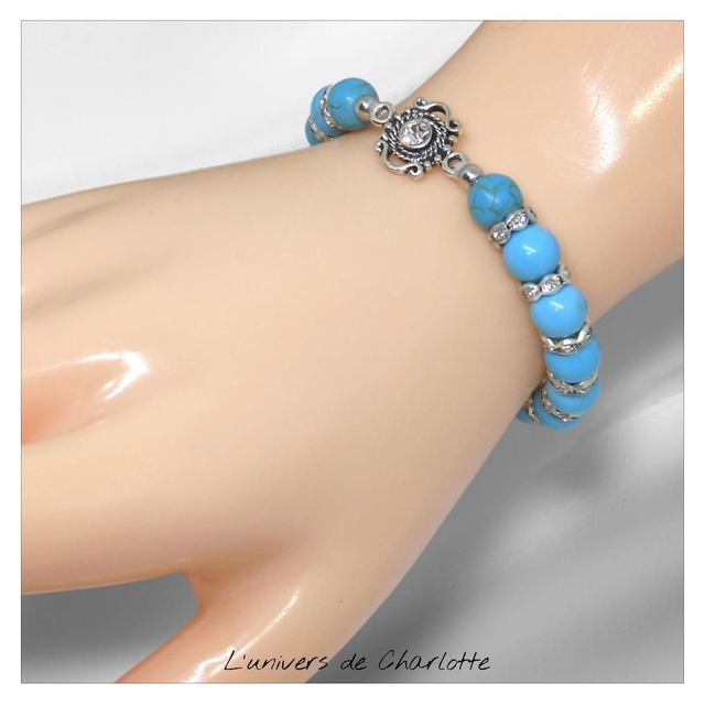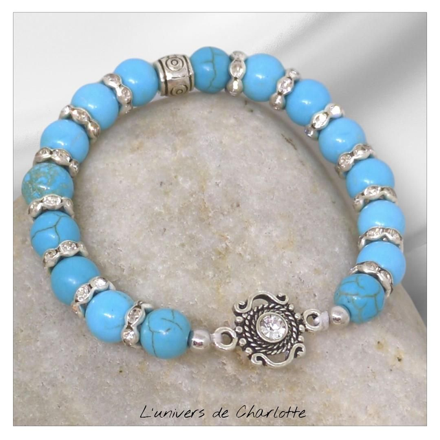 En perles de Turquoise (howlite teintée), symbole de protection et d'équilibre, orné d'une breloque argentée représentant la liberté et la connexion à la nature.