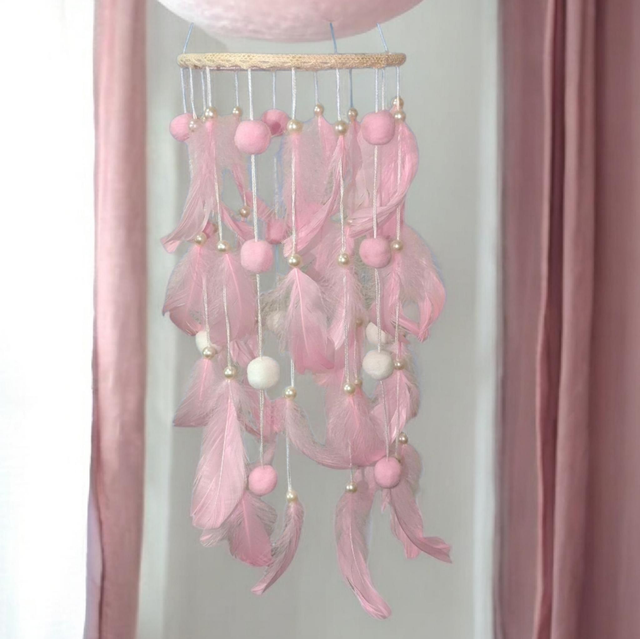 Sous la délicatesse de ses plumes et la danse de ses fils tissés, cet attrape-rêve garde les songes comme un gardien bienveillant.