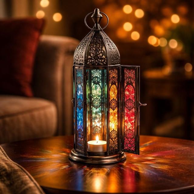 Grande lanterne orientale 7 chakra en métal argenté et vitraux colorés (rouge, orange, jaune, vert, bleu clair, bleu foncé et violet). En Inde, les lanternes sont utilisées pour les décorations et les festivités. Lumière d'ambiance apaisante, lanterne à poser ou à accrocher, avec porte et support pour une bougie chauffe-plat.