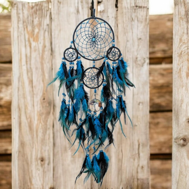 Sous la délicatesse de ses plumes et la danse de ses fils tissés, cet attrape-rêve garde les songes comme un gardien bienveillant.