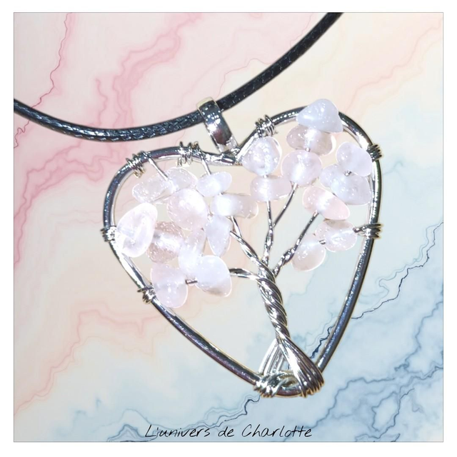 Pendentif coeur "Arbre de vie" en pierre naturelle de Quartz rose